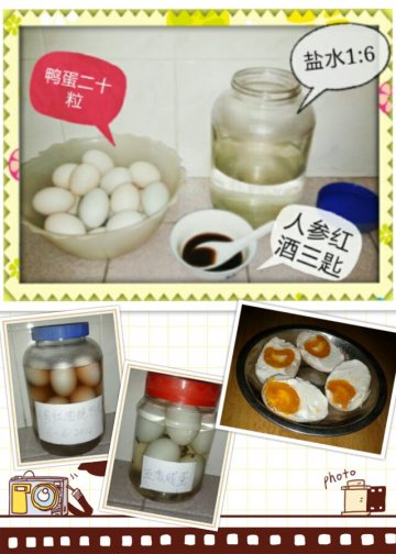 鸭蛋10粒,盐1杯;水6杯(1比6),烈酒3汤匙(我用了红酒,其实红酒的酒精成分是不够高的,我只是用红酒来浸了人参后才知道用错了,开瓶后又没人喝酒,幸好没出差子)