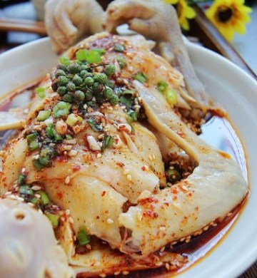 1、将公鸡宰杀去毛,除去内脏,洗净,入沸水锅中煮一刻钟;掺入半瓢冷水。2、待水再次煮开时,将鸡翻面再煮约10分钟,再掺入半瓢冷水。待水烧开之后翻面,用小竹刺刺入鸡肉内,无血珠冒出时即可捞起,放入冷开水中浸泡1小时,取出晾干。3、鸡皮上刷一层芝麻油,再将鸡头、颈、翅、胸脯、背脊分部位宰开,鸡头切成两块,其汆用小木棒轻捶,使之柔软,切成筷子粗的条装盘,食用时、将红油辣椒、芝麻粉、花椒粉、芝麻油、口蘑、酱油、白糖、葱花、味精等调匀成汁,即可蘸食。
