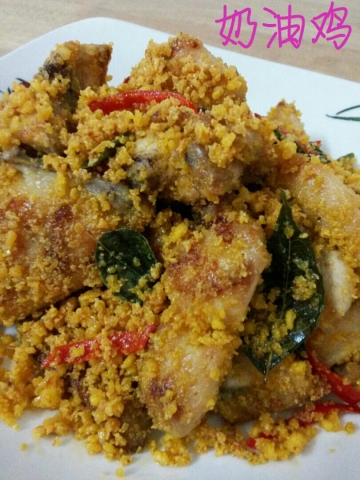鸡半只,蛋黄3粒,淡奶1汤匙,牛油3汤匙,红辣椒1条(切丝),咖哩叶(洗净)适量