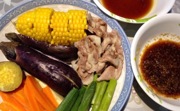 5、吃的时候,把蔬菜和肉沾一下酱汁再吃。