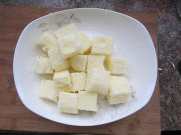 5、第二天想吃的时候,拿出来,把已经凝固的奶糊倒扣出来,切小方块。