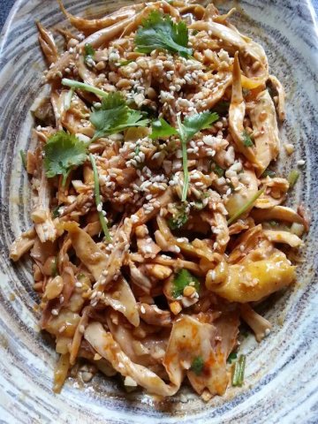 6、调制好的酱汁浇在手撕鸡上,撒上花生米碎、白芝麻、香菜即可!吃的时候翻拌一下使调料味道均匀的裹在鸡上!麻辣鲜香的手撕鸡做好啦!有没有想吃的?!