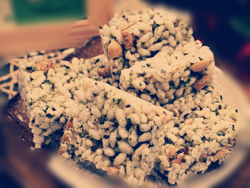 2、將米香粒、熟黑芝麻與花生放入烤箱中保溫備用。烤箱預熱至100/100度讓食材保持溫熱即可。