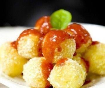 5.锅中留少许油加入番茄酱,待番茄酱冒泡时加入炸好的土豆球即可