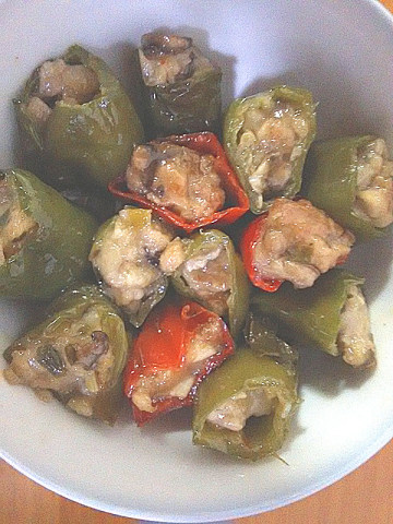 辣椒中填入的馅料可以根据个人的口味调整,喜欢吃猪肉的可以放入猪肉馅。