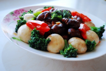 4、再依次边炒边加口蘑、西兰花、彩椒,炒的间隙放盐、糖、耗油、生抽调味。