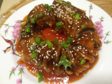 11、将做好的糖醋汁往茄子上浇,注意往连接的缝儿里面浇,