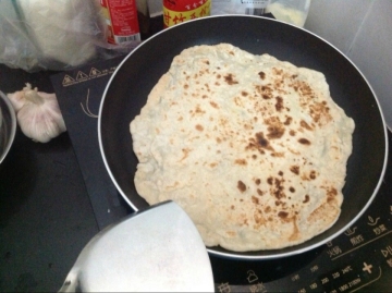 4、平底锅加一点点油热锅,热锅后加入面饼,慢火煎香煎熟。