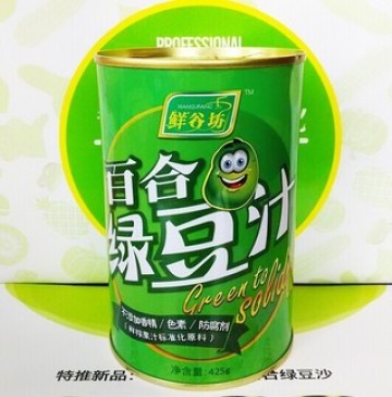 1.取出一罐鲜谷坊百合绿豆汁,倒入搅拌机中