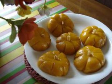 把南瓜饼做成象南瓜一样的形状,觉得特别可爱,最主要的是,为了哄骗我们宝贝,多吃一点:)
