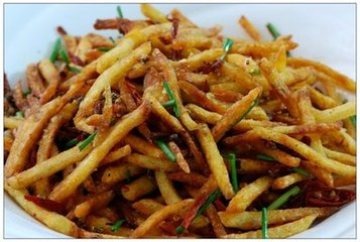 土豆三个切成土豆丝,用冷水泡几分钟,然后把水倒掉,放吉食粉一小把,淀粉一大把,拌好,然后大火把油烧热,接着将土豆丝放入,炸到飘起来,然后倒出,接着放花椒,蒜末,姜丝,辣椒小葱,放少半勺味精和鸡精,炒俩两下,接着把炸好的土豆丝放入连续翻滚两下,即可出锅