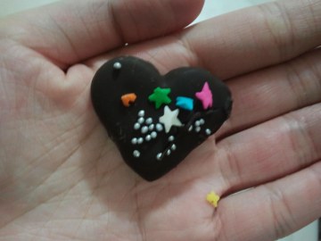 8、变硬后就用爱心的模型切出,然后刷上蛋白,把爱心和起来。