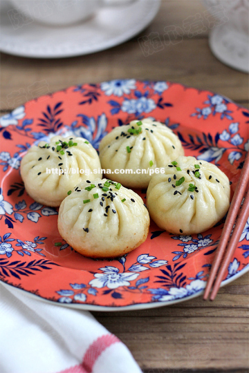 3、将面团分成均匀小份,擀成薄圆块,包入肉馅适量,包成包子状,待发酵后煎熟,撒上少许葱花即可。