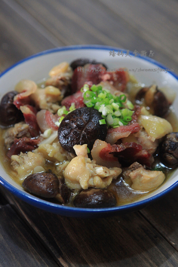 主料:嫩鸡半只(可用几个鸡腿或数个鸡翅切块代替)、花菇6朵(可用干香菇代替)、火腿1块(不要选择太精的火腿,没有油份,不香)