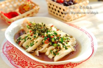 6、将花椒油泼在步骤4的料碗中,加煮鸡的原汤、盐、糖和少许蒸鱼豉油拌匀,浇在斩件的鸡上,最好浸泡1小时之后再吃。