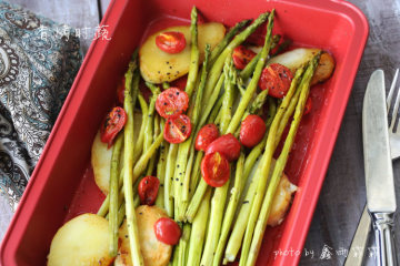 芦笋500g,土豆1个,圣女果10个,海盐 1/4 t, 黑胡椒 1/4 t,橄榄油50ml