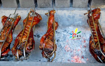 (3)将夹好兔的铁夹放到烤炉上,然后不断的将烤炉上的兔进行翻转,以免兔被烤焦,如果是专门的全自动的烤炉,就不需要手动去翻转兔,如果没有,则需要手动去翻转。