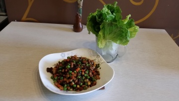 热锅中火,腊肉和豆豉辣酱入油锅煸香,倒入香干和香菇丁,煸炒半分钟,下入鲜笋和胡萝卜丁,加入黄豆酱,继续翻炒约一分钟,倒入豌豆、生抽,翻炒均匀后装盘。
