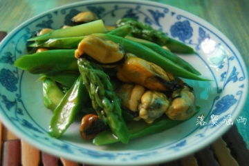 4、水烧开,下芦笋煮6-7分钟,将海虹肉咋锅里涮一下,和芦笋一下捞出,滤干水分,装载盘子里;