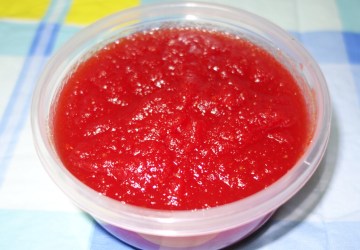 6. 番茄酱用消过毒的玻璃罐密封后,就能长时间保存。我们的番茄酱会比较快用完,所以没有装罐,直接放在冷藏室的……