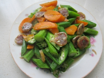 秋葵150克,胡萝卜1根,香肠50克,油、盐、鸡精适量。
