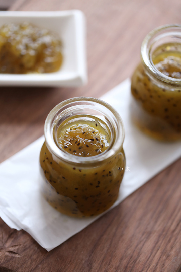 6.煮到果酱粘稠,尝一下味道,根据甜度添加适量柠檬汁。趁热装入玻璃瓶中盖好盖子,倒置保存。