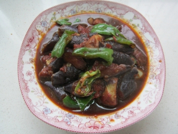 4、茄子烧变软时放青椒翻炒,再放盐和鸡精调味即可出锅。