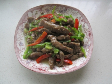 青红椒各1个,牛柳200克,盐、酱油、油、鸡精适量。