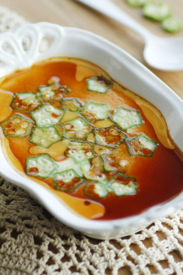 4、表面放切成片状的秋葵,并加盖保鲜膜或盖上盖子。