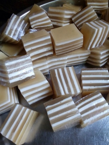 4、放一层小黄(即搅拌好的黄糖水),等2分钟,再加上小白(即搅拌好的耶浆),如此类推。记得等一层凝固后再放另一层哦!不然就会混在一起咯!(薄薄一层口感会好吃点哟!)要是做的厚每一层等的时间需要长点哦!最后一层要用小黄哦!会好看点哦!