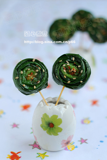 3、取一根韭菜,从根部卷起,卷成直径约3厘米的圆形,用一根牙签从中间穿过固定,做成棒棒糖的样子;