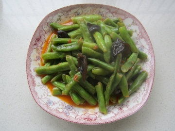 2、起锅热油煸炒刀豆片刻,放番茄、木耳和少许水焖煮约3分钟。
