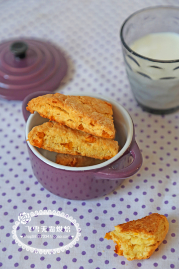 黄油32克切碎,和低筋面粉150克,泡打粉4克,盐1克,糖12克,牛奶100克,芒果干28克