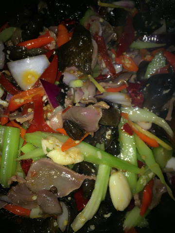 1.鸡杂洗净切片,焯水备用。