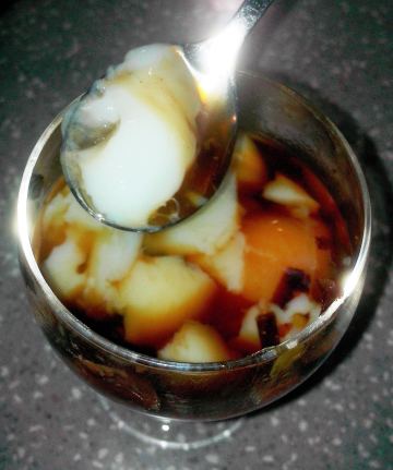 (4)将温泉蛋打入碗中,再舀入2大匙的调味汁以及适量的葱花,也可以放入少许的芥茉,即可食用。