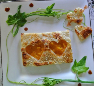 3)起油锅将中式烧饼两面煎成焦黄,开夹层,上层用心形模压出两心形。在夹层中涂南瓜泥,盖上上层。南瓜色显出两心形,放在碟中间。