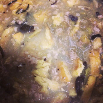 4、煲一锅水,放姜,放入全部材料。加盐调味。最后勾芡。加胡椒粉。就完成了。