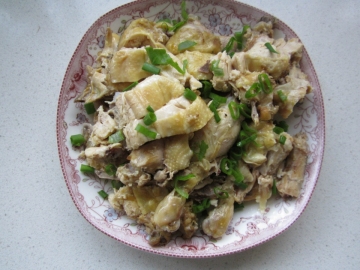 4、晾干表皮,浇上熟花生油,斩成小块,盛入碟中,摆成鸡形。吃时佐以姜茸、葱丝