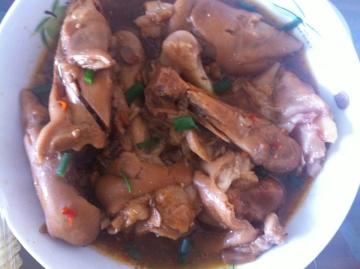 猪脚、香叶、桂皮、茴香、葱段、黄豆酱、花椒、辣椒、生抽、老抽、老酒