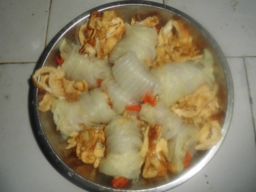 5.然后,用筷子将其摆入特制的淡绿色白菜盘中,呈白菜形;