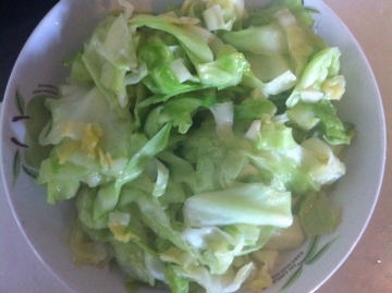 3、然后放入包菜与盐拌匀,包菜按照自己口味,我喜欢不要太熟,味道很好,有虾皮放点更好。
