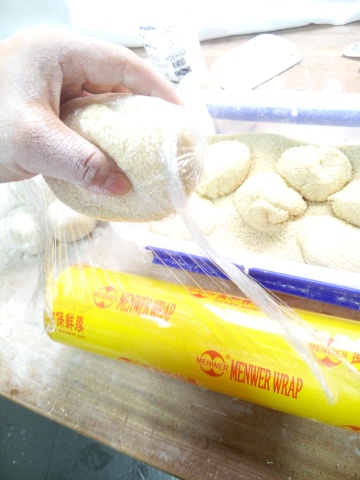 3、均匀后从打面桶中弄出,搓成长条切一个一个250克一个 沾水滚芝麻,裹上保鲜膜 放常温,用时撕掉保鲜膜就可以炸制!4 油温大概130度左右,不用按压不停翻滚就可以!。整个过程大约需要2-3分钟左右。吃时在底下接个盘子,用分餐刀轻轻敲一下,球体就碎裂成片,分食即可。