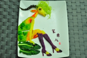 6、各就各位捏出形状摆放好,撕下西芹的筋做头发,本想用玉米须做头发效果会更好,跑了两个菜场木有买到,临时用了西芹筋效果还不错,除了这个其他是可以吃的哦,食材不会浪费。