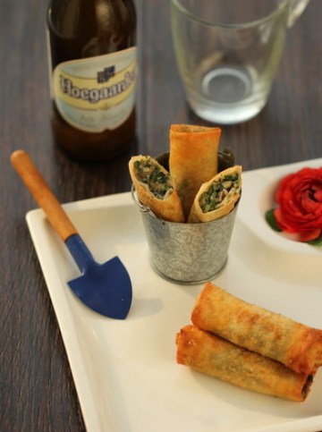 9、 中间不停翻面, 直到春卷炸至金黄, 捞出来控油;
