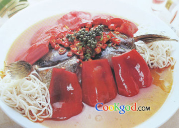 2.红椒切大片,用精盐渍过,盖在鱼头上面,上笼旺火蒸熟,取出撒上葱姜丝,淋热油上桌。