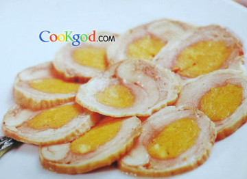 2、鸡蛋摊成蛋皮,抹上虾茸,卷成“如意”卷,蒸熟后切片,码在鸭块四周;