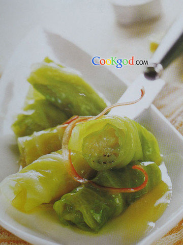 3.将姜汁、精盐、味精、白糖放入容器中调匀,再将包好的菜包放入,浸卤约20分钟,捞出后装入深盘子,再用卤汁浸没菜包,即可上桌食用。
