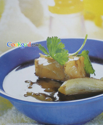 (3)将炸好的蹄膀、材料(2)及调味料一起放入内锅,用火加热煮沸后,改小火卤煮20∼25分钟后,加盖熄火,再放入焖烧锅中焖4小时。如果肉质想更熟烂,可以取出内锅,做第2次加热,然后再放入焖烧锅中焖约1小时后,即可食用。