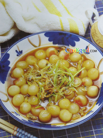 4、将油放锅内烧热,倒入蛤蜊汤,将两种萝卜加入,小火焖煮至熟烂时,以淀粉勾芡,再将蛤蜊肉及蒜苗丝撒入拌匀,再淋上肉苁蓉汁即可。