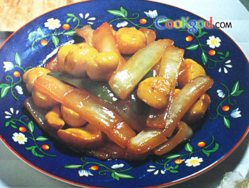 (3)炒勺内加猪油烧开,放葱、姜烹锅,加上白菜、高汤、调料、栗子烧烂即成。